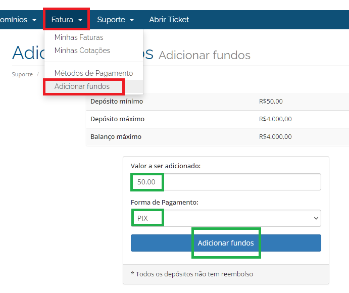 Acesse o menu "Faturas" e "Adicionar Fundos";